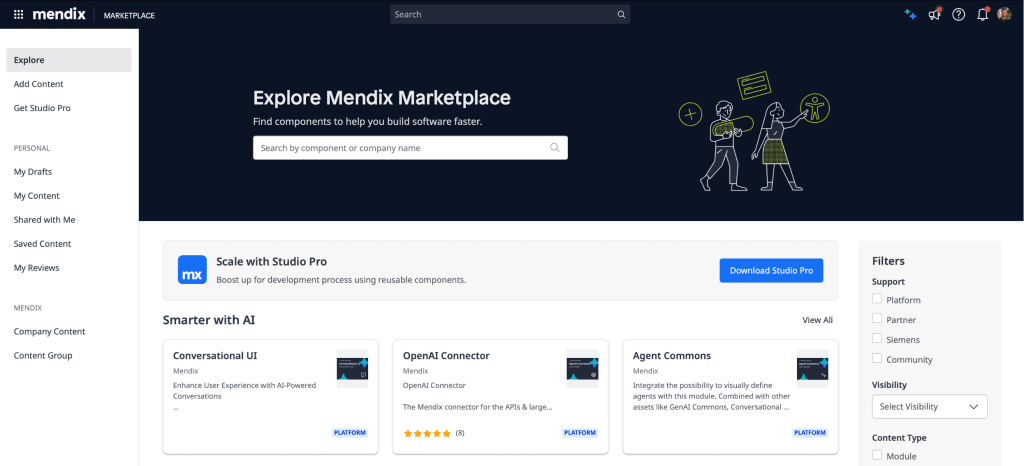 ฟีเจอร์ Marketplace Curation ช่วยให้บริษัทต่าง ๆ สามารถกำหนดกฎเกณฑ์และแนวทางของตนเองสำหรับเนื้อหาสาธารณะใน Mendix Marketplace เมื่อคอมโพเนนต์ใดผ่านตามกฎเหล่านั้น จะได้รับป้ายพิเศษ — ซึ่งเดิมเรียกว่า “Recommended”