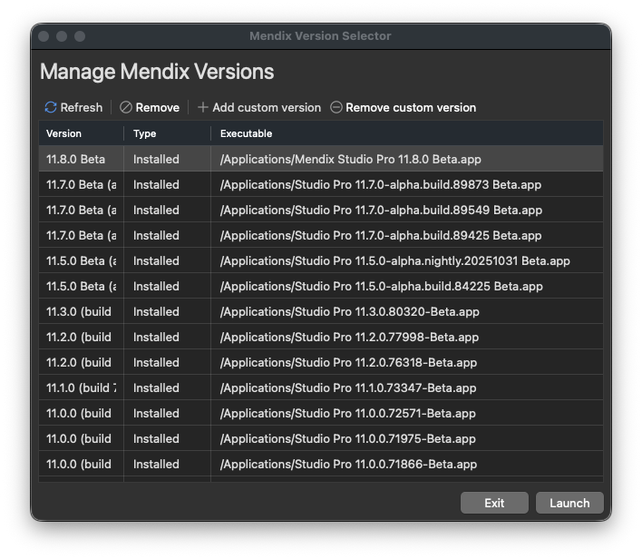 ก่อนหน้านี้ Mac users ไม่มี Version Selector ใน release นี้ Version Selector พร้อมใช้งานบน Mac แล้ว เป็นส่วนหนึ่งของ Studio Pro 11.8 Mac Beta ติดตั้ง Studio Pro 11.8 แล้วจะได้รับโดยอัตโนมัติ ช่วยให้เปิดโปรเจกต์จาก Cloud และ local exports ในเวอร์ชันที่ถูกต้องได้ทันที