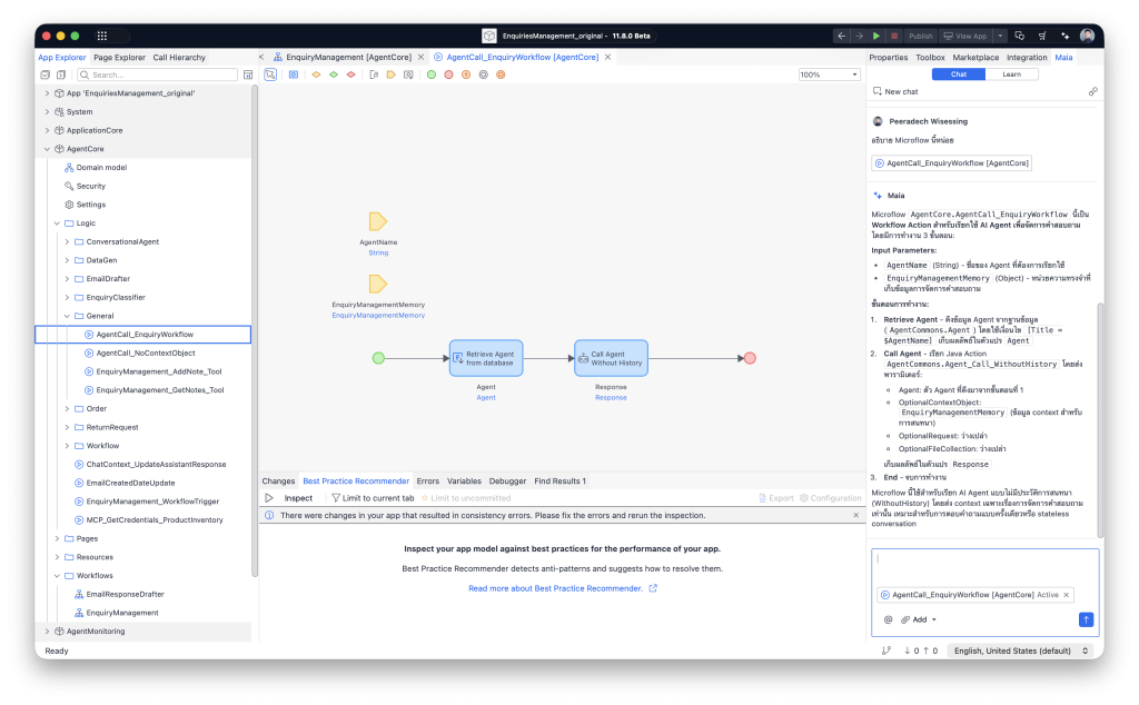 • สำหรับ microflows ที่ซับซ้อน: Maia จะวาง outline ของ activities ทั้งหมดที่จำเป็น พร้อมคำแนะนำผ่าน Chat