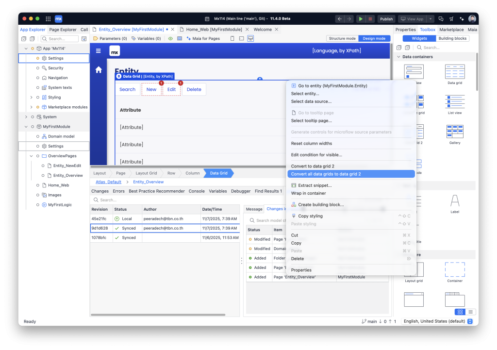 เรารู้สึกตื่นเต้นที่จะประกาศฟีเจอร์ใหม่ทรงพลังชุดใหญ่ ซึ่งออกแบบมาเพื่อเพิ่มประสิทธิภาพประสบการณ์การพัฒนา และปลดล็อกความเป็นไปได้ใหม่ ๆ ในระบบนิเวศของ Mendix ตั้งแต่ประสบการณ์ที่ลื่นไหลยิ่งขึ้นใน Studio Pro ด้วยระบบ History แบบไม่บล็อกงาน (non-blocking) และขนาดหน้าต่าง dialog ที่ใหญ่ขึ้น ไปจนถึงความสามารถเพิ่มประสิทธิภาพอย่างการแปลง widget แบบกลุ่ม (batch widget conversion), เทมเพลต overview แบบปรับแต่งได้, และการเลือกข้อมูลแบบ “Select All” ใน Data Grid 2 — รีลีสนี้เน้นทั้งความเร็วและความยืดหยุ่นเป็นหลัก