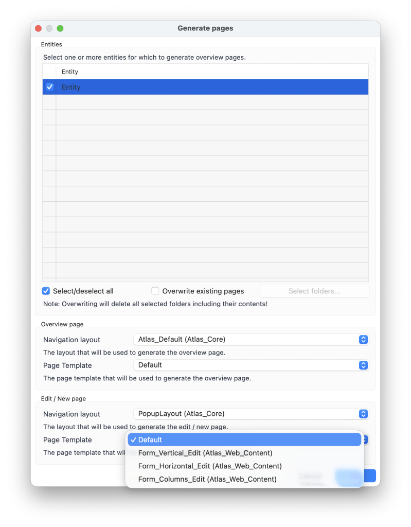 ตอนนี้ คุณสามารถเลือก custom template เพื่อใช้ในการสร้าง overview pages ได้ ทำให้หน้ารายการและฟอร์มที่ถูกสร้างขึ้นสอดคล้องกับ design system ของคุณตั้งแต่แรกเริ่ม ไม่ต้องเสียเวลาแก้ไขหน้าที่สร้างขึ้นทีละหน้าเพื่อให้เข้ากับแบรนด์ของคุณอีกต่อไป