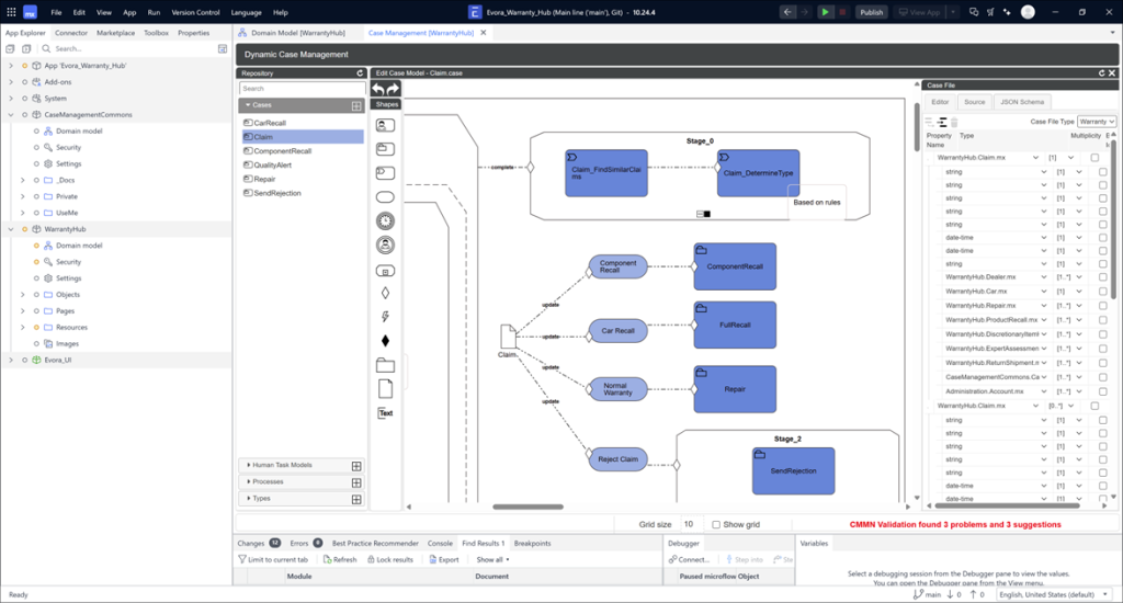ด้วยส่วนเสริม (add-on) ใหม่ตัวนี้ คุณสามารถออกแบบ case model ได้โดยตรงจาก Studio Pro โมดูล DCM ได้ถูกผสานรวม (integrated) อย่างลึกซึ้งกับ Domain-Specific Languages (DSLs) ของ Mendix Studio Pro เพื่อมอบแนวทางแบบครบวงจรสำหรับงาน Case Management